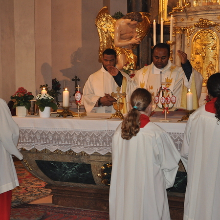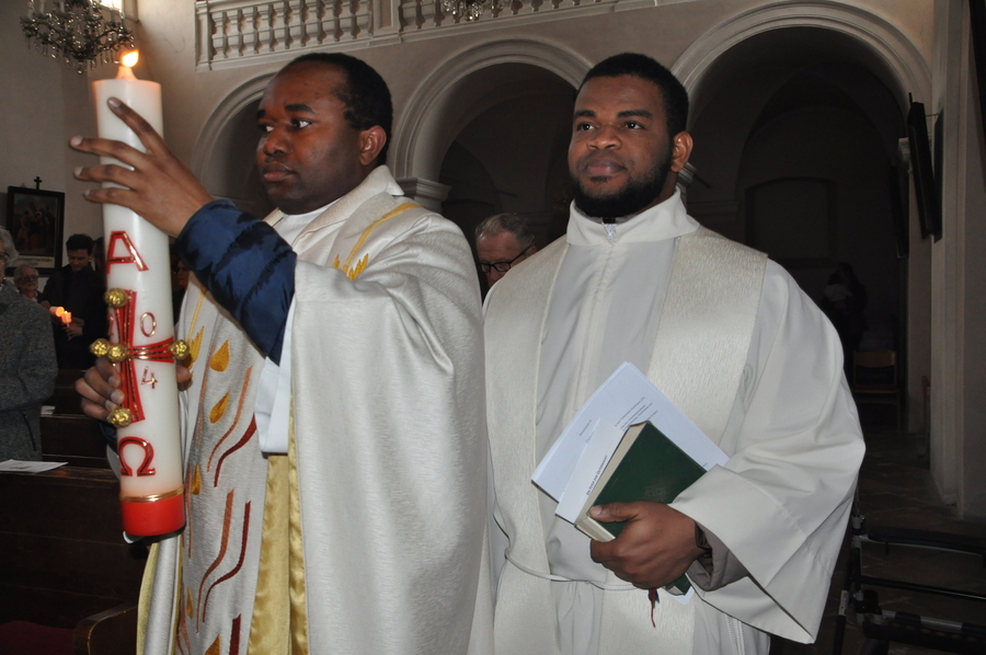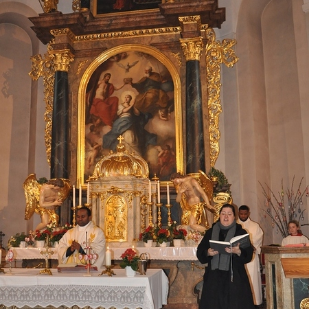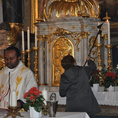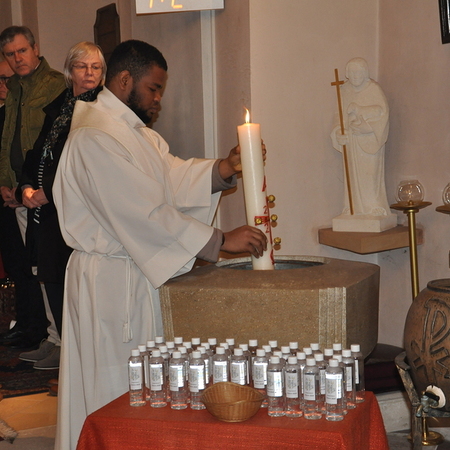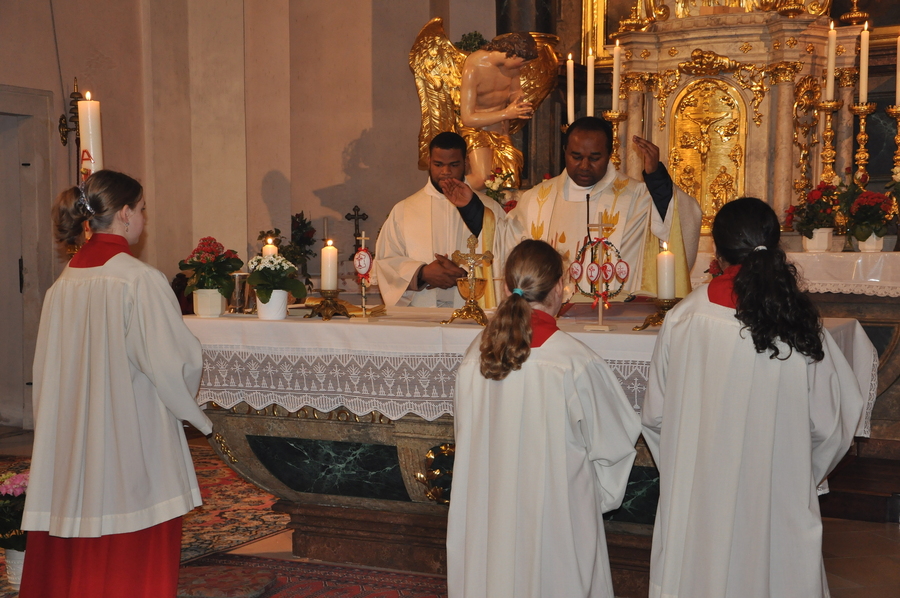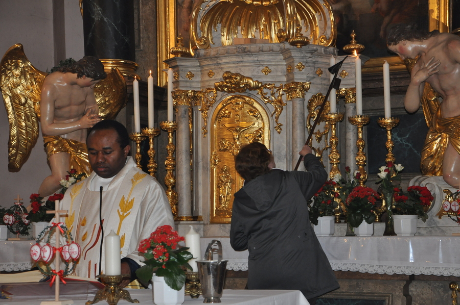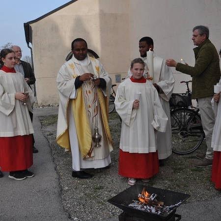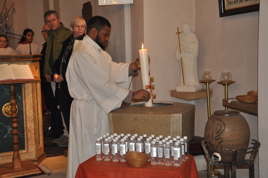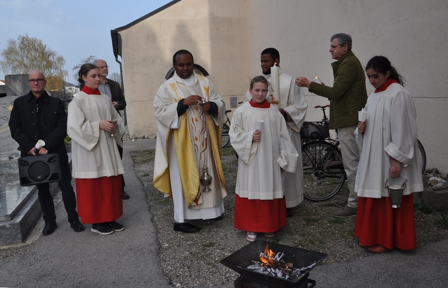 Auch heuer durften wir diese festliche Messe wieder mit vielen Mitgliedern aus unserer Gemeinde begehen: Nachdem vor der Kirche die Osterkerze am Feuer entzündet wurde, trugen Pater Pius und die Ministranten das österliche Licht in die Kirche und verteilten es an die anwesenden Gläubigen.