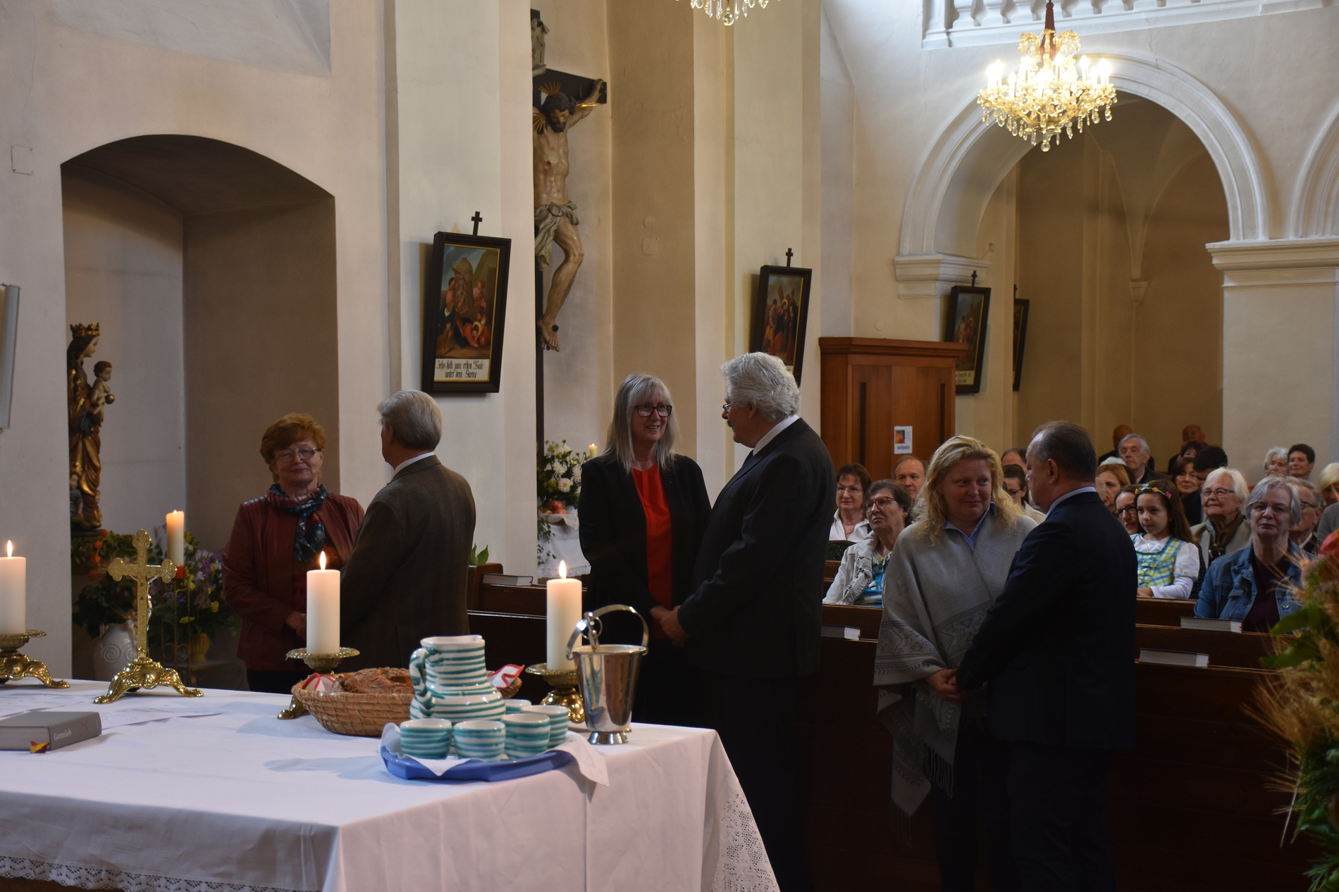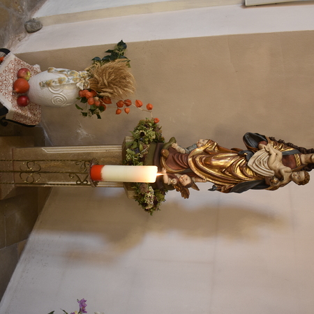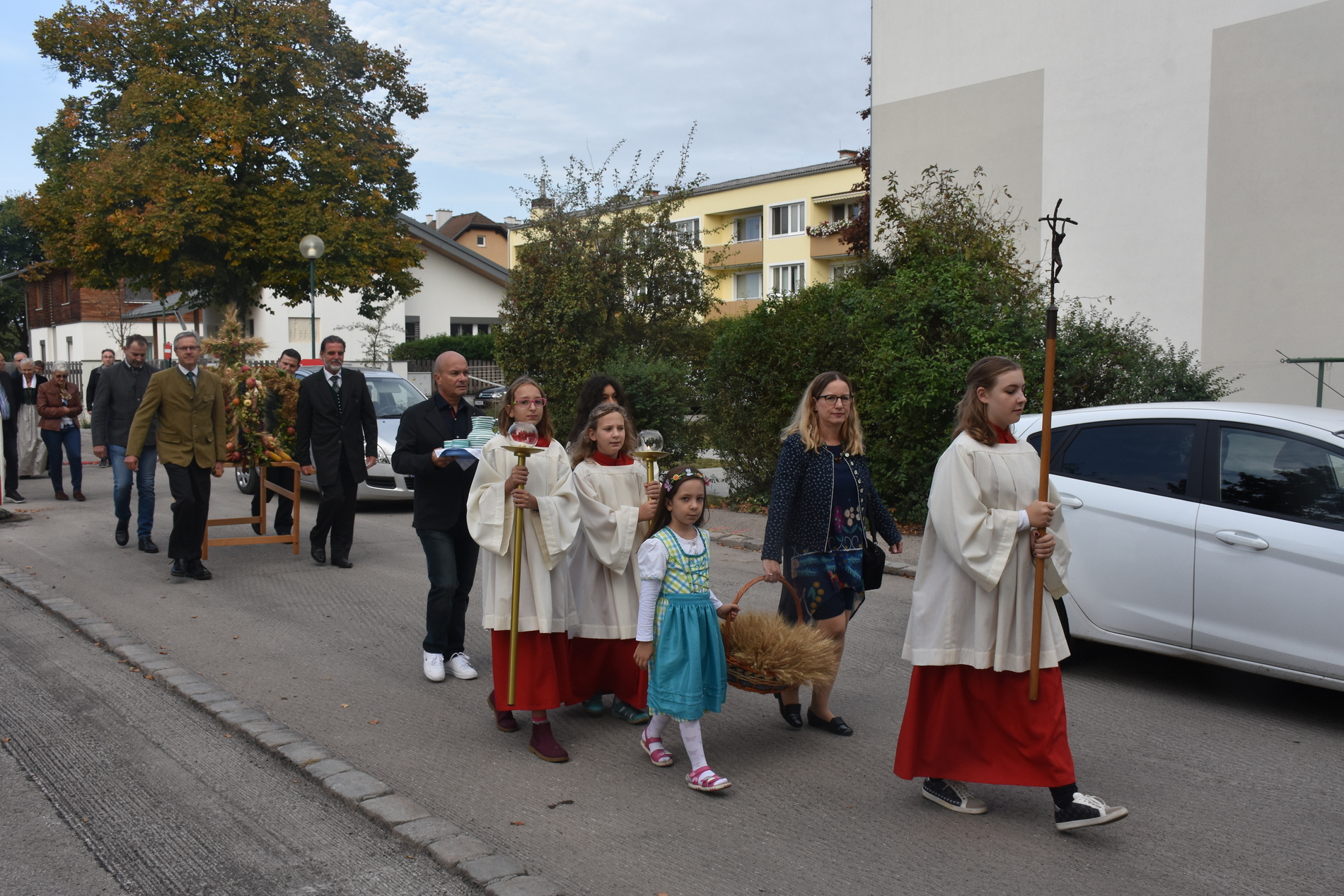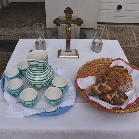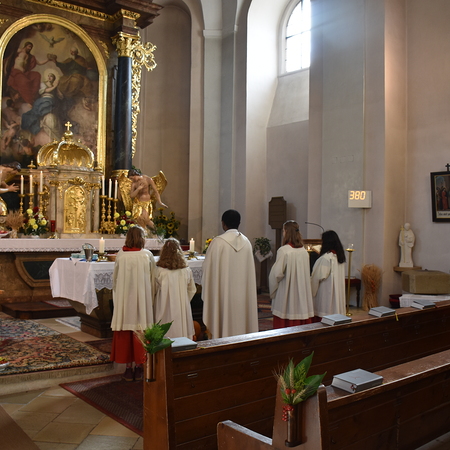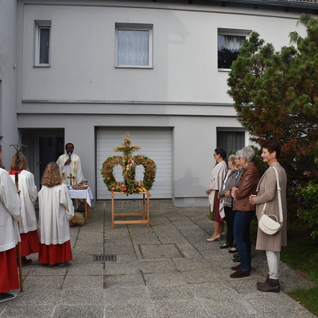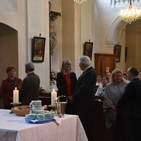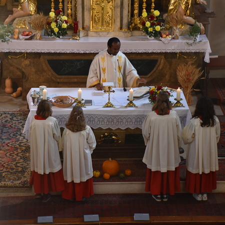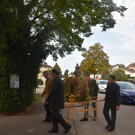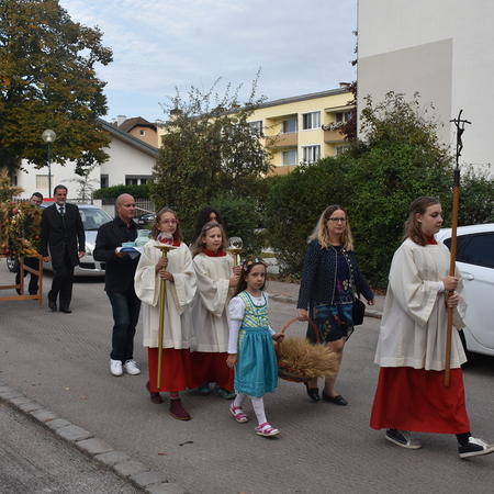 Traditionell am 1. Sonntag im Oktober beging die Pfarre Langenlebarn das Erntedankfest. Kurz vor der Messe wurde die Erntekrone heuer zum ersten Mal im Zuge einer kurzen Prozession in die Kirche getragen, nachdem Pater Pius vor dem Pfarrhof einige einleitende Worte und Segen gesprochen hatte. Während der Messe, die vom Chor Amici Musici musikalisch gestaltet wurde, wurden auch die Jubelpaare gefeiert. Anschließend lud die Pfarre zur Agape in den Pfarrhof.