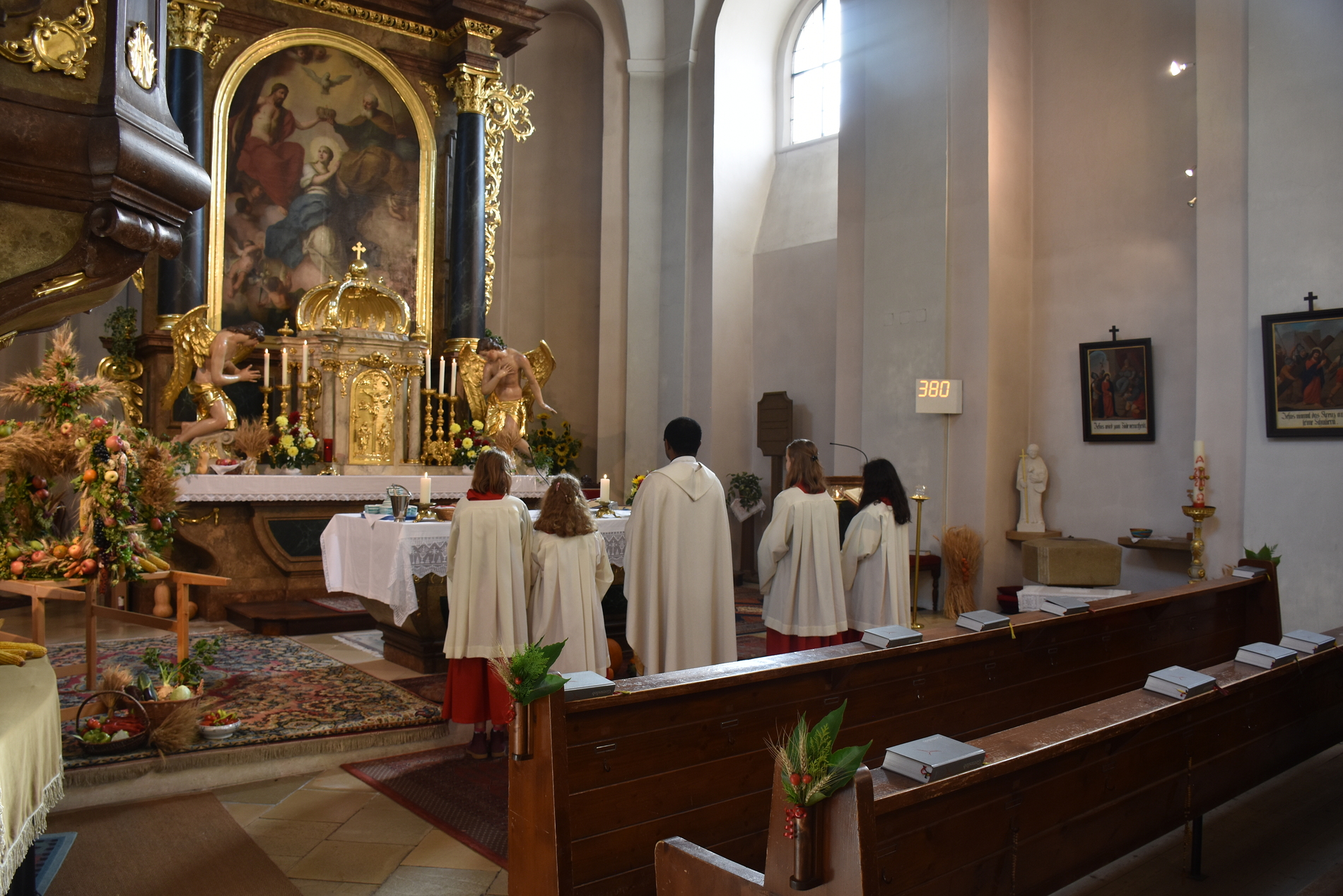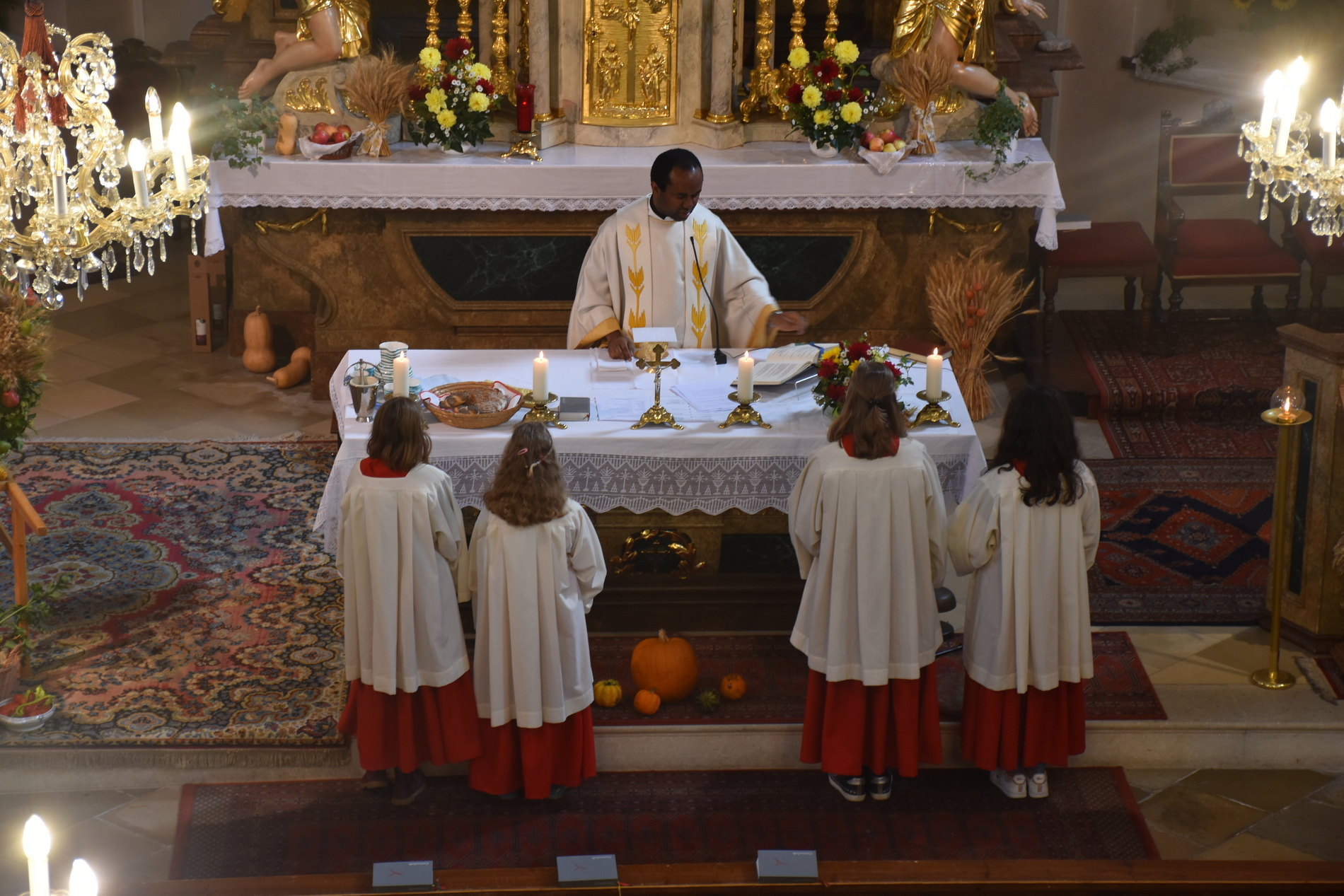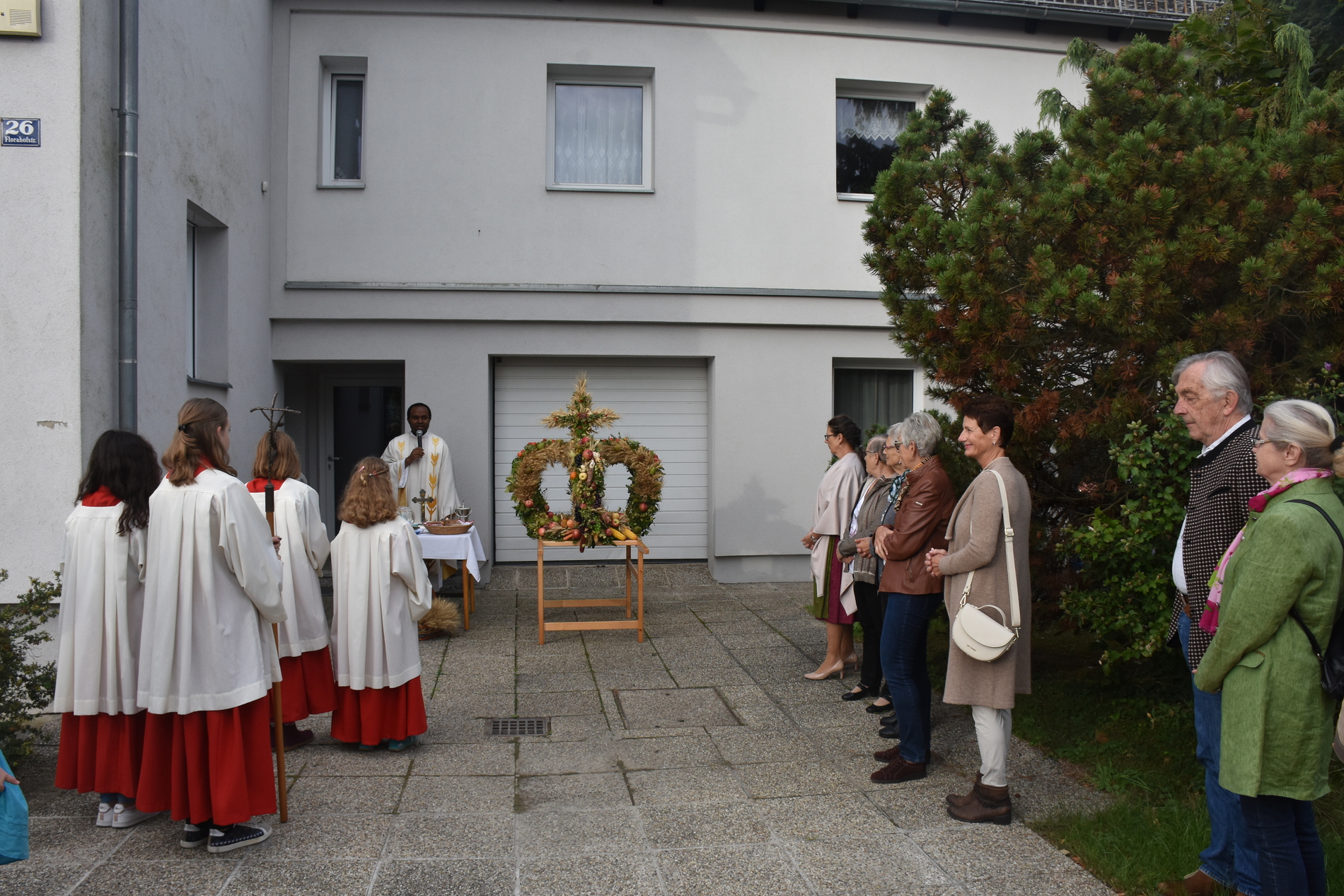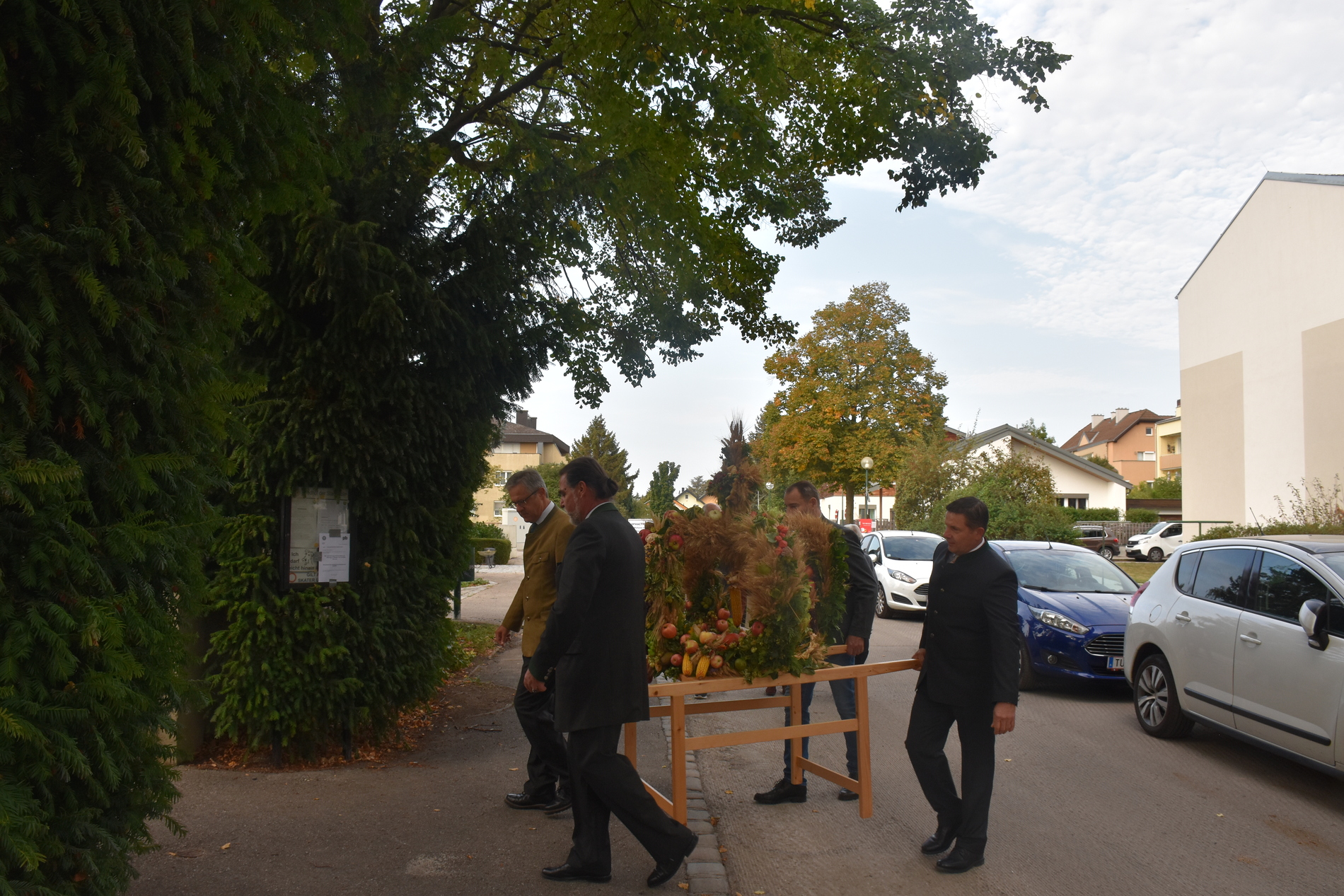 Traditionell am 1. Sonntag im Oktober beging die Pfarre Langenlebarn das Erntedankfest. Kurz vor der Messe wurde die Erntekrone heuer zum ersten Mal im Zuge einer kurzen Prozession in die Kirche getragen, nachdem Pater Pius vor dem Pfarrhof einige einleitende Worte und Segen gesprochen hatte. Während der Messe, die vom Chor Amici Musici musikalisch gestaltet wurde, wurden auch die Jubelpaare gefeiert. Anschließend lud die Pfarre zur Agape in den Pfarrhof.