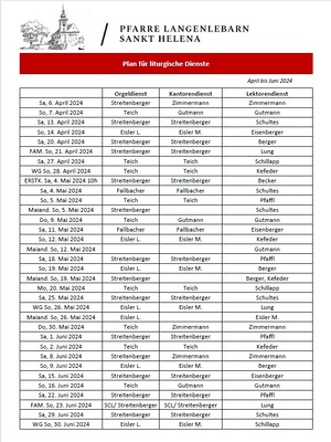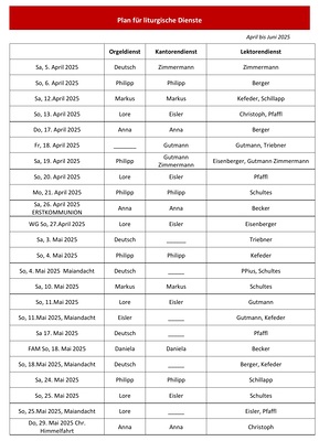 Plan für liturgische Dienste 2. Quartal 2024